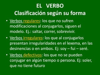 El documento habla sobre la clasificación y conjugación de los verbos en español. Los verbos se clasifican según su terminación (1a, 2a, 3a conjugación), regularidad (regulares e irregulares), uso (transitivos, impersonales, etc.) e importancia (nuclear, auxiliar, modal). La conjugación varía según persona, número, tiempo, modo, aspecto y voz, y existen diferentes usos de los tiempos verbales.