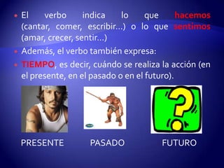 El verbo expresa acciones o estados y cambia de forma para indicar tiempo, modo, número y persona. Existen formas personales y no personales del verbo. Los verbos se clasifican en tres conjugaciones y pueden ser regulares u irregulares. Algunos verbos tienen doble participio, uno regular y otro irregular.