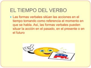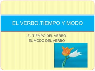 Este documento explica el tiempo y el modo del verbo en español. El tiempo del verbo sitúa las acciones en el pasado, presente o futuro dependiendo del momento en que se habla. El modo indica si el hablante considera la acción real, un deseo o una orden, y puede ser indicativo, subjuntivo o imperativo.