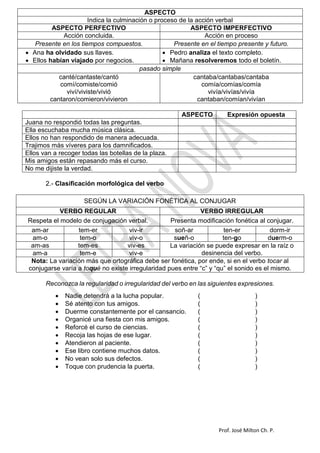 Este documento define y clasifica el verbo como una categoría gramatical que indica acción, estado o existencia. Explica que el verbo varía según el número, persona, tiempo, modo, aspecto, regularidad/irregularidad, presencia/ausencia de sujeto, semántica y limitaciones de conjugación. Se clasifican los verbos en copulativos, predicativos, transitivos, intransitivos, defectivos y pronominales. Finalmente, presenta las perífrasis verbales con participio, gerundio e infinitivo.