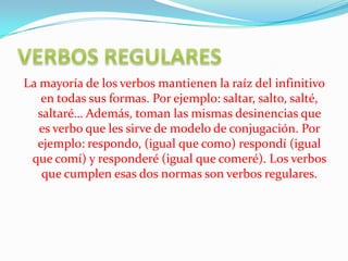 Este documento discute los verbos regulares e irregulares en español. Explica que los verbos regulares mantienen la misma raíz en todas sus formas y siguen las mismas desinencias de conjugación, mientras que los verbos irregulares cambian su raíz o desinencias en algunas formas. También proporciona ejemplos como "dormir" para ilustrar verbos irregulares y métodos para identificar si un verbo es regular o irregular.