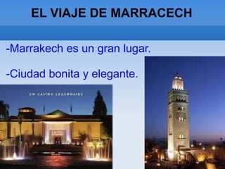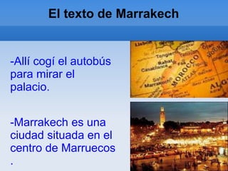 Marrakech es una ciudad situada en el centro de Marruecos conocida por ser roja, bonita y elegante, con muchos palacios históricos como el palacio que el autor visitó en autobús. Su plaza patrimonio de la humanidad Jamá-Fna y su antiguo y famoso cementerio, junto con la Kutubia que se parece a la Giralda de Sevilla, hacen de Marrakech una ciudad famosa y hermosa.