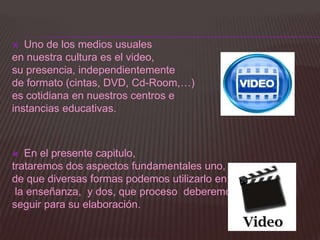 El documento describe las diferentes formas en que el video puede utilizarse en la enseñanza, incluyendo como transmisor de información, instrumento motivador y herramienta de evaluación. Explica que el video puede usarse para presentar temas, transmitir información, suscitar debates y permitir la visualización de procesos. También destaca que el video ofrece la posibilidad de que los estudiantes observen sus propias ejecuciones para analizar su comportamiento y corregir errores.