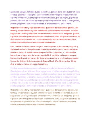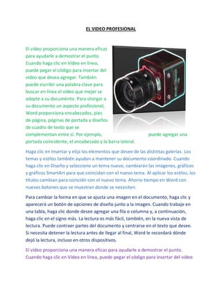 El documento describe las diferentes funciones de Microsoft Word que permiten agregar videos y otros elementos multimedia para hacer que los documentos se vean más profesionales. También explica cómo aplicar temas y estilos para mantener la coherencia visual y cómo Word ofrece nuevas funciones que ahorran tiempo, como botones contextuales.