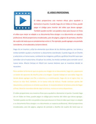 El documento describe las funciones de diseño y formato en Microsoft Word que permiten agregar videos, imágenes y otros elementos para darle un aspecto profesional a un documento. Word ofrece opciones para insertar videos de manera sencilla y encontrar el diseño adecuado aplicando temas y estilos coherentes.