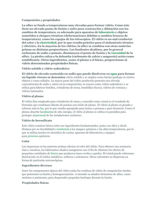 El documento proporciona información sobre el vidrio, incluyendo su fabricación a partir de una mezcla de sílice, fundentes y estabilizantes calentados a altas temperaturas. Describe los principales tipos de vidrio como el vidrio sodocálcico, de borosilicato y al plomo, y sus usos. También resume los métodos para moldear el vidrio, como soplado y colado, y producir diferentes tipos de vidrio como de ventana, placa y botellas.
