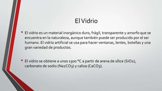 El documento describe la historia y los procesos de fabricación del vidrio. Explica que el vidrio se descubrió accidentalmente en Fenicia cuando unos mercaderes calentaron arena con natrón. También describe los principales métodos para fabricar vidrio plano como el vidrio crown, el vidrio cilíndrico y el vidrio flotado. Finalmente, resume la Pirámide de Vidrio del Louvre, incluyendo sus dimensiones, materiales como el vidrio y acero inoxidable, y el sistema de "arañas" para unir la estructura metálic