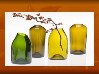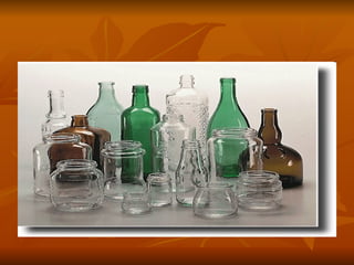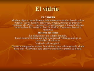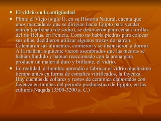El documento habla sobre la historia del vidrio. Explica que los primeros vidrios fueron naturales como la obsidiana que se usaba hace 75,000 años. Luego, los fenicios descubrieron cómo fabricar vidrio al fundir arena, cenizas y sodio. El vidrio se usó para hacer vasijas en Egipto desde 3500 a.C. En la Edad Media, se usó para hacer mosaicos y vitrales en las iglesias de Europa. Actualmente, el proceso de fabricación involucra fundir arena, sodio y caliza a altas temper