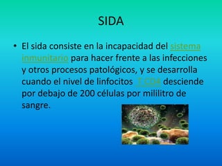 El VIH se transmite a través de fluidos corporales como la sangre, el semen y las secreciones vaginales. Infecta las células CD4 del sistema inmunológico y puede provocar el SIDA si no se trata, lo que deja al cuerpo vulnerable a infecciones. Los métodos para prevenir la transmisión incluyen el uso de condones, tener una sola pareja sexual no infectada y evitar el intercambio de fluidos. No hay una cura, pero los tratamientos antirretrovirales pueden controlar el virus y prolongar la vida de
