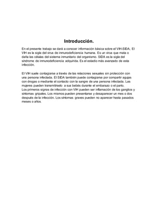 Este documento presenta un trabajo realizado por 5 estudiantes de 9° grado sobre el VIH-SIDA y otras enfermedades de transmisión sexual. El trabajo describe la transmisión, síntomas y prevención del VIH-SIDA, con el objetivo de brindar información a la población y promover medidas para evitar su propagación.