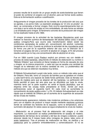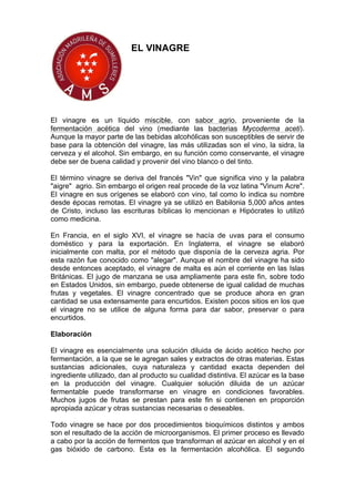 El vinagre se produce a través de la fermentación acética del alcohol. Existen diversos tipos de vinagre según la materia prima utilizada, como el vinagre de vino, sidra, malta, frutas o destilado. El proceso general implica la fermentación alcohólica que convierte el azúcar en alcohol, seguida de la fermentación acética donde bacterias transforman el alcohol en ácido acético, dando como resultado el vinagre.
