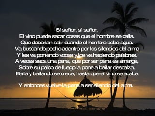 El poema describe cómo el vino puede sacar emociones y verdades ocultas en las personas. El vino les da valentía a aquellos que esconden su verdadera naturaleza cobarde y les permite expresar sus culpas y penas. Sin embargo, el poema también celebra el vino cuando es bebido por alguien puro de corazón que puede disfrutarlo sin ocultar su verdadero yo.