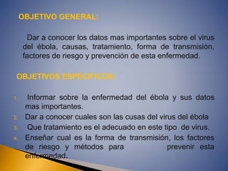 El documento proporciona información sobre el virus del Ébola, incluyendo sus causas, síntomas, tratamiento y prevención. El virus del Ébola causa fiebre hemorrágica en humanos y primates y se transmite a través del contacto con fluidos corporales infectados. No existe una cura establecida, pero los brotes más recientes han ocurrido en África occidental y han causado miles de muertes.