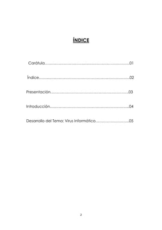 El documento presenta información sobre los virus informáticos, incluyendo su historia, características, métodos de propagación y métodos de protección. Explica que los virus son programas maliciosos que infectan computadoras sin el permiso del usuario y pueden dañar o robar información. También describe cómo los primeros virus aparecieron en la década de 1970 y desde entonces han evolucionado, afectando principalmente a sistemas Windows. Finalmente, resume métodos para prevenir infecciones como usar antivirus y filtrar archivos sospechosos.