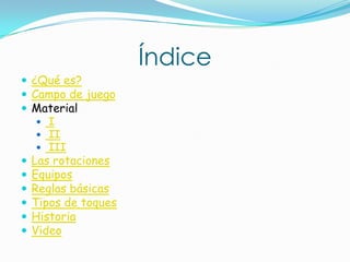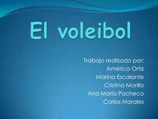 Este documento describe los aspectos fundamentales del voleibol, incluyendo el campo de juego, el material utilizado como la red y el balón, las rotaciones de los jugadores, los equipos, las reglas básicas, y los diferentes tipos de toques como el saque, bloqueo, recepción, colocación y remate. También resume brevemente la historia del deporte y cómo fue creado.