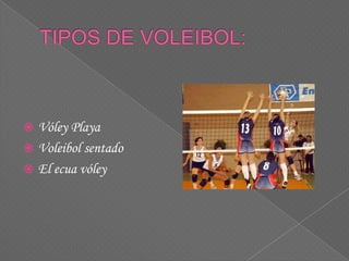 El documento describe las reglas y características básicas del voleibol. El campo mide 18m x 9m dividido por una red de 1m de ancho. Los jugadores usan camiseta, pantalón corto y protecciones. Un partido consta de 3-5 sets al mejor de 25 puntos con ventaja de 2. Se gana anotando puntos por errores del equipo contrario como enviar el balón fuera o más de 3 toques.