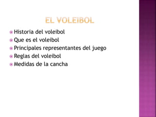 El voleibol es un deporte de equipo donde dos equipos intentan pasar un balón sobre una red hacia el campo adversario, con reglas específicas sobre toques y posiciones. Existen diversas modalidades, como el vóley playa y el voleibol sentado, cada una con sus características particulares. El reglamento abarca desde la forma de servir y marcar puntos hasta las dimensiones del campo y el número de jugadores en cada variante.