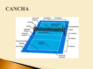 El voleibol es un deporte de equipo que se juega dividido en dos mitades por una red. Cada equipo está compuesto por 6 jugadores cuyo objetivo es pasar el balón por encima de la red al campo contrario antes de que el otro equipo logre devolverlo correctamente. El voleibol fue creado en 1895 por William G. Morgan en Estados Unidos como alternativa al baloncesto que necesitaba menos equipamiento.