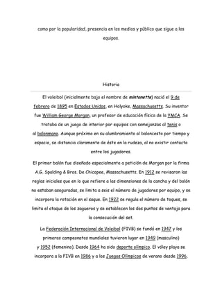 El voleibol es un deporte de equipo que se juega sobre una cancha dividida por una red, donde dos equipos tratan de pasar el balón al campo contrario mediante golpes limpios. Se originó en 1895 en Estados Unidos e incorporó varias reglas en años posteriores. Actualmente es uno de los deportes olímpicos más populares y existen diversas modalidades como el voleibol de playa.