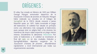 Este documento presenta información sobre el deporte del voleibol. Proporciona detalles sobre el origen del voleibol en 1895, sus fundadores William G. Morgan y Alfred T. Halstead, y cómo se ha desarrollado y difundido internacionalmente. También describe los fundamentos técnicos del juego, como saques, recepciones, bloqueos y colocaciones, así como las reglas básicas y los sistemas de puntuación y rotación de jugadores.