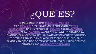 El documento define el volumen como la extensión en tres dimensiones de una región del espacio. Explica que el volumen es una magnitud derivada de la longitud que se calcula multiplicando la longitud, ancho y altura de un objeto. También describe algunos objetos comunes para medir volumen como probetas graduadas, jeringas y volumenómetros, y explica cómo usarlos.
