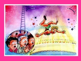 Este documento resume el cuento "El vuelo de los cóndores" de Abraham Valdelomar. Narra la historia de un niño llamado Abraham que queda fascinado al ver la llegada de un circo al puerto. Un día llega tarde a casa por observar el circo y es regañado por su madre. Más tarde, su padre le obsequia entradas para ir al circo con su familia. En el circo, una artista llamada Miss Orquídea sufre un accidente durante su acto en el trapecio y fallece días después.