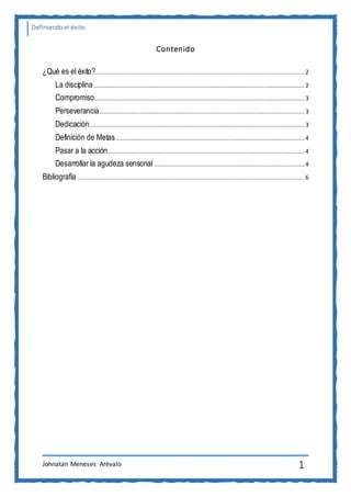 El documento define el éxito como el resultado satisfactorio de una tarea. Para lograr el éxito se requiere disciplina, compromiso, perseverancia y dedicación, así como definir metas claras y tomar acción. Las encuestas muestran que menos de la mitad de las personas tienen éxito regularmente y que muchos no disfrutan su trabajo o se rinden fácilmente.