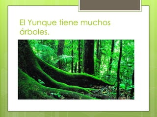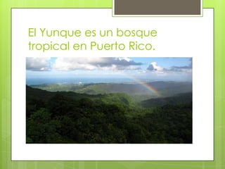 El Yunque es un bosque tropical en Puerto Rico que contiene muchos árboles grandes, ríos y cascadas, así como flores bonitas, insectos, arañas, pájaros como loros, mariposas y los pequeños coquís que caben en la mano.
