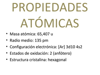 El documento resume las propiedades atómicas y físicas del zinc, así como los procesos de obtención y aplicaciones principales de este metal. El zinc se obtiene mediante la extracción de minerales, su trituración, flotación y posterior tratamiento por vía seca o húmeda para obtener el óxido de zinc, que se somete a electrólisis para depositar zinc metálico. Sus principales usos son la galvanización del acero, la fabricación de baterías y piezas de automoción.