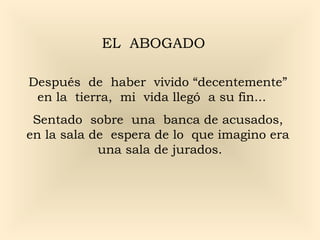 El documento narra la historia de un hombre que se encuentra en juicio ante Dios después de morir. Satanás actúa como fiscal y acusa al hombre de todos sus pecados. Jesús es el abogado del hombre y reconoce sus pecados, pero argumenta que el hombre aceptó a Jesús como su salvador y por lo tanto es libre gracias al sacrificio de Jesús en la cruz. Dios falla a favor del hombre y lo declara libre, frustrando a Satanás. Jesús guía al hombre al cielo, explicándole que siempre gana los juicios representando a aqu