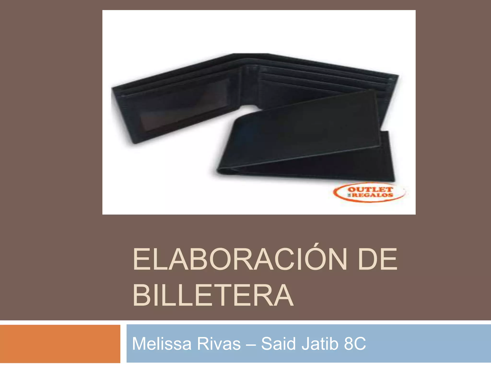 Este documento describe los materiales y procesos necesarios para elaborar una billetera. Explica que se necesita cuero, tela estampada, tijeras, máquina de coser y pegamento. Luego detalla los pasos del proceso, que incluyen cortar un rectángulo de cuero y tela, pegarlos juntos, doblar los extremos hacia adentro y coser alrededor para formar la billetera. Finalmente, concluye que se aprendió cómo hacer una billetera de manera simple.