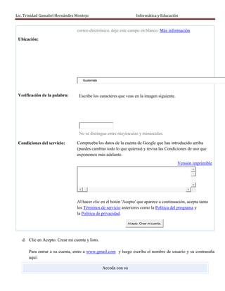 El documento describe los pasos para crear una cuenta de correo electrónico de Gmail, crear un blog en Blogger, y una cuenta en SlideShare. Explica cómo agregar entradas y gadgets al blog, y cómo subir presentaciones a SlideShare. Proporciona instrucciones detalladas sobre cada paso del proceso con capturas de pantalla para ilustrarlo.
