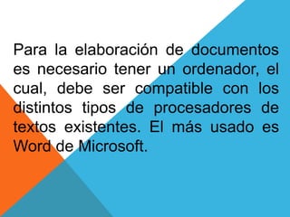 La elaboración de documentos requiere un ordenador con un procesador de textos como Word de Microsoft. Los documentos se crean y guardan como archivos que pueden editarse y compartirse fácilmente. El formato de los documentos incluye opciones de fuente, párrafo, inserción de imágenes, tablas, encabezados y pies de página. Las secciones permiten variar el formato en diferentes partes del documento.