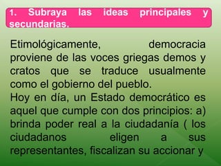 El documento resume el origen y definición de la democracia. Etimológicamente, la democracia proviene de las voces griegas "demos" y "cratos", que significa "gobierno del pueblo". Actualmente, un Estado democrático se define como aquel que brinda poder real a los ciudadanos, como elegir representantes y participar en decisiones, y garantiza la igualdad ante la ley para todos los ciudadanos.