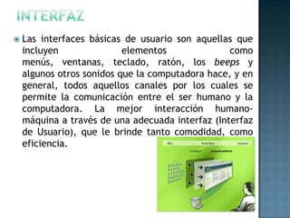El documento describe las etapas del proceso de elaboración de una interfaz gráfica de usuario. Estas incluyen 1) recibir un guión de diseño, 2) crear un concepto visual acorde a la aplicación y usuario, 3) desarrollar propuestas de diseño, 4) desarrollar las pantallas con elementos como fondo, texto, video e imágenes, 5) clasificar las pantallas como de inicio, contenido, trabajo o créditos, 6) armar las pantallas integrando los elementos, y 7) revisar y entregar las pantallas