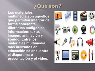 Este documento describe los materiales multimedia y sus usos en educación. Explica que las presentaciones multimedia y videos son recursos útiles cuando integran de forma coherente texto, imágenes, animación y sonido. También describe criterios para crear presentaciones multimedia efectivas como buena visibilidad, esquematización, complementariedad de medios, evitar sobrecarga cognitiva y resaltar elementos fundamentales. Finalmente, señala que los videos también son útiles cuando están bien diseñados desde una perspectiva técnica y pedagógica.