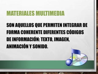 Los materiales multimedia permiten integrar de forma coherente texto, imágenes, animación y sonido. Entre los ejemplos más utilizados en el ámbito educativo están las presentaciones y videos. Una presentación multimedia se utiliza para presentar o comunicar información utilizando múltiples medios físicos o digitales, y puede verse en escenario, proyectarse, transmitirse o reproducirse localmente.