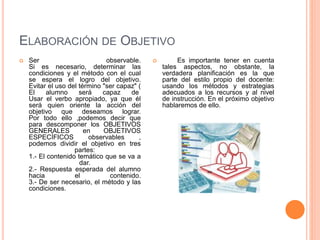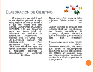 El documento explica cómo elaborar objetivos generales y específicos para la enseñanza. Los objetivos generales describen lo que se desea lograr de manera general sin incluir resultados observables, mientras que los objetivos específicos detallan cómo alcanzar el objetivo general mediante la inclusión de contenidos temáticos, respuestas esperadas y condiciones de evaluación. Al redactar los objetivos se deben seguir criterios como dirigirlos al estudiante, usar lenguaje claro, ser observables y emplear verbos que indiquen la acción deseada