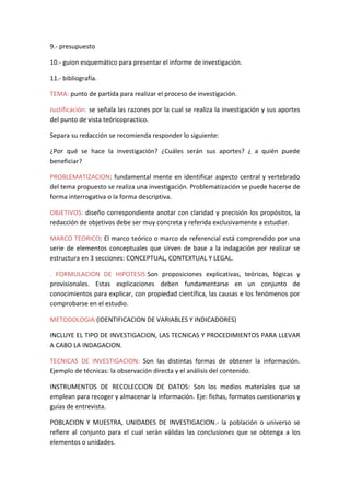 El proyecto de investigación resume los antecedentes teóricos y metodológicos sobre el problema de estudio y sirve de guía para el proceso de investigación. Tiene varias funciones como precisar el problema a investigar, evaluar la importancia y factibilidad del tema, orientar la búsqueda de información necesaria, describir el proceso metodológico, y establecer plazos y recursos. La estructura típica de un proyecto incluye el tema, la justificación, la problematización, los objetivos, el mar