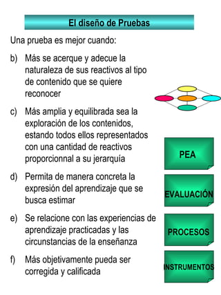 El documento habla sobre el diseño de pruebas para evaluar el aprendizaje. Explica que una buena prueba mide los contenidos más importantes de manera equilibrada y se relaciona con las experiencias de aprendizaje. También describe los pasos para elaborar una prueba como determinar los objetivos a evaluar, elaborar los instrumentos y analizar los resultados.