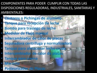 El proceso de elaboración de queso incluye (1) la recepción y almacenamiento de leche cruda, (2) la pasteurización y estandarización de la leche, y (3) la coagulación, corte, molienda, prensado y maduración de la cuajada para producir el queso final. El queso terminado se empaca al vacío y se almacena a bajas temperaturas para su distribución y venta.