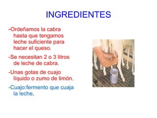 El documento describe el proceso de fabricación de queso de cabra. Se necesitan 2-3 litros de leche de cabra, que se cuecen a 70°C durante 30 minutos y luego se enfrían a 30-40°C antes de añadir cuajo líquido o zumo de limón para cuajar la leche. La cuajada resultante se escurre en un paño durante 3 horas antes de colocar el queso fresco en un plato y servirlo con miel u hierbas.