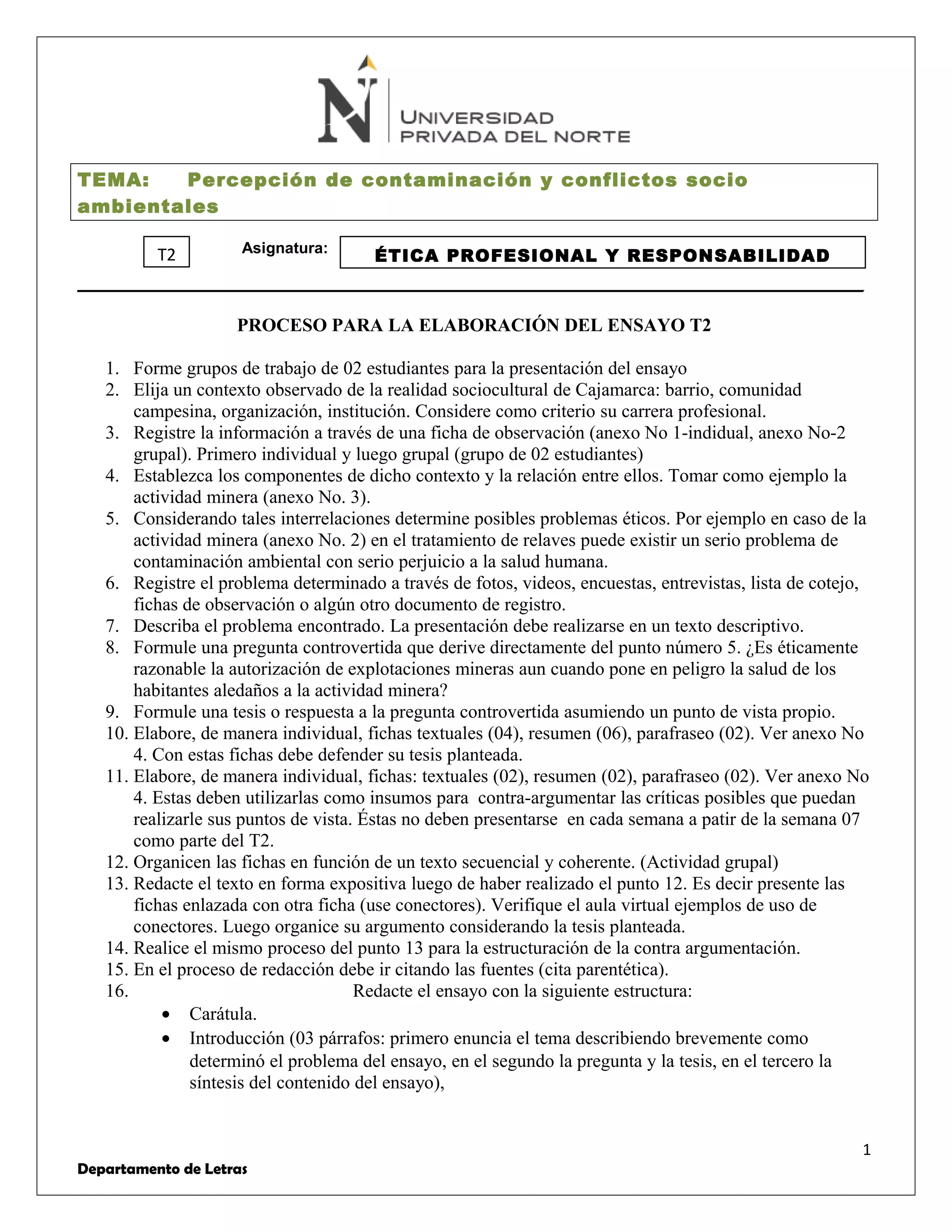 Este documento proporciona instrucciones para la elaboración de un ensayo sobre percepción de contaminación y conflictos socioambientales. Indica que los estudiantes deben formar grupos de dos personas, observar un contexto de la realidad sociocultural de Cajamarca relacionado a su carrera, identificar posibles problemas éticos, y elaborar fichas y un borrador del ensayo defendiendo una tesis y ofreciendo una contraargumentación con citas bibliográficas. El ensayo final debe tener una introducción, cuerpo y conclusiones sobre el tema observado