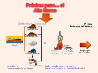 El documento resume los procesos clave para la obtención de hierro y acero, incluyendo la extracción del mineral de hierro, su procesamiento en un alto horno para producir arrabio, y los métodos posteriores como el convertidor de oxígeno y el horno eléctrico para refinar el arrabio en acero. También describe brevemente procesos como la laminación para dar forma al acero.