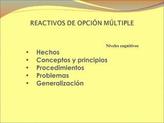 El documento presenta un taller de opción múltiple sobre geografía para estudiantes de sexto grado. Explica cinco niveles cognitivos esperados (hechos, conceptos, principios, procedimientos y generalización) y nueve preguntas de geografía diseñadas para evaluar estos niveles. Cada pregunta indica el nivel cognitivo, la referencia bibliográfica y la respuesta correcta.