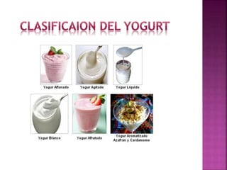 El documento proporciona información sobre la producción de yogur. Describe los pasos clave en el proceso, que incluyen mezclar leche fresca y en polvo, calentarla a 80°C para pasteurizarla, enfriarla a 42°C, agregar cultivos lácticos, incubar durante 3 horas, enfriar durante 12 horas más, y envasar el producto final en recipientes individuales. El yogur resultante contiene bacterias probióticas beneficiosas.