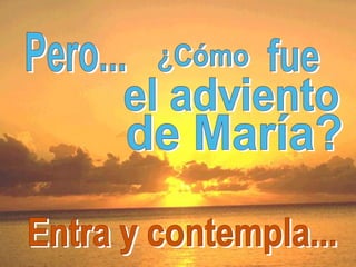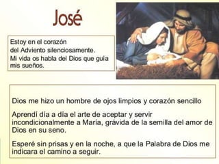 El documento presenta las perspectivas de Isaías, Juan Bautista, José y María sobre el Adviento. Cada uno refleja el rostro de un Dios compasivo que se preocupa por los pobres y marginados. Isaías muestra a un Dios justo. Juan Bautista habla de la sencillez de Dios. José acoge silenciosamente el plan de Dios. María es un ejemplo de oración, fe en Dios y esperanza alegre.
