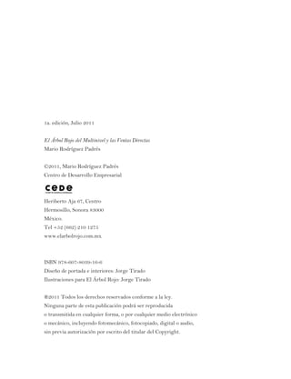 Este documento es el prólogo del libro "El Árbol Rojo del Multinivel y las Ventas Directas" de Mario Rodríguez Padrés. El prólogo introduce el libro como una obra que provee información valiosa sobre cómo desarrollar y tener éxito en negocios de multinivel y ventas directas. El autor espera que el libro ayude a clarificar interrogantes sobre esta industria y a dignificar y profesionalizar la misma.