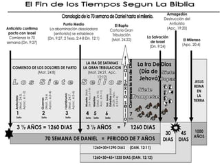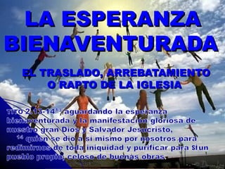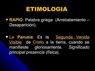 El documento compara el arrebatamiento de la iglesia y la segunda venida de Cristo, señalando siete diferencias clave entre los dos eventos. Explica que el arrebatamiento ocurre antes de la Gran Tribulación, cuando Cristo viene en secreto por su iglesia, mientras que la segunda venida ocurre después de la tribulación, cuando Cristo regresa visiblemente con su iglesia para establecer su reino terrenal. También analiza las profecías de Daniel que distinguen entre estas dos etapas distintas.