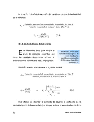 El documento describe los conceptos de elasticidad de la demanda y sus tipos. Explica que la elasticidad de la demanda mide la sensibilidad de las cantidades demandadas ante cambios en factores como el precio, el ingreso y el precio de otros bienes. Se definen la elasticidad precio como la variación porcentual de la cantidad demandada ante cambios porcentuales en el precio propio. También se define la elasticidad ingreso como la variación porcentual de la cantidad demandada ante cambios porcentuales en el ingreso del consumidor. Finalmente, se ilustra el c
